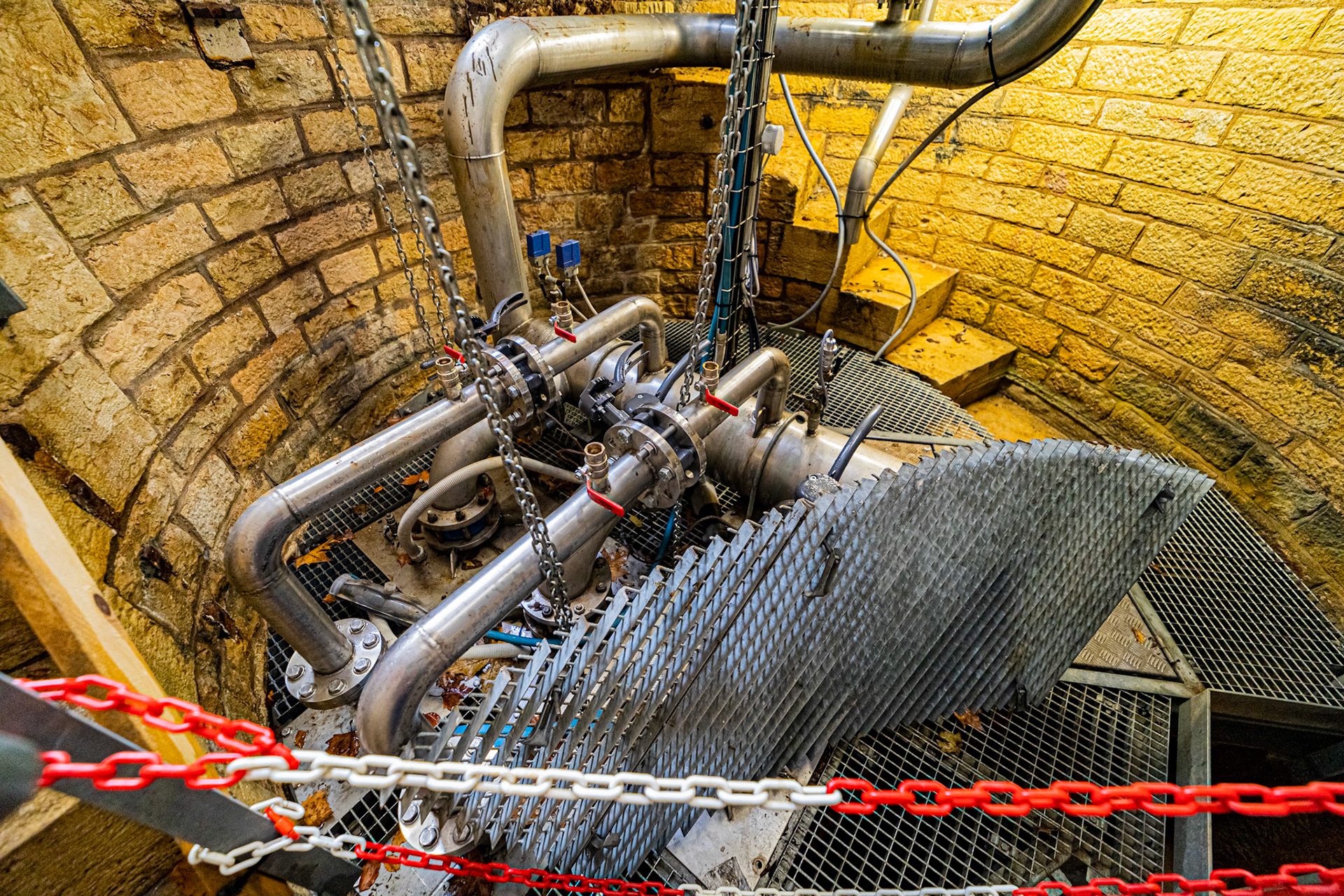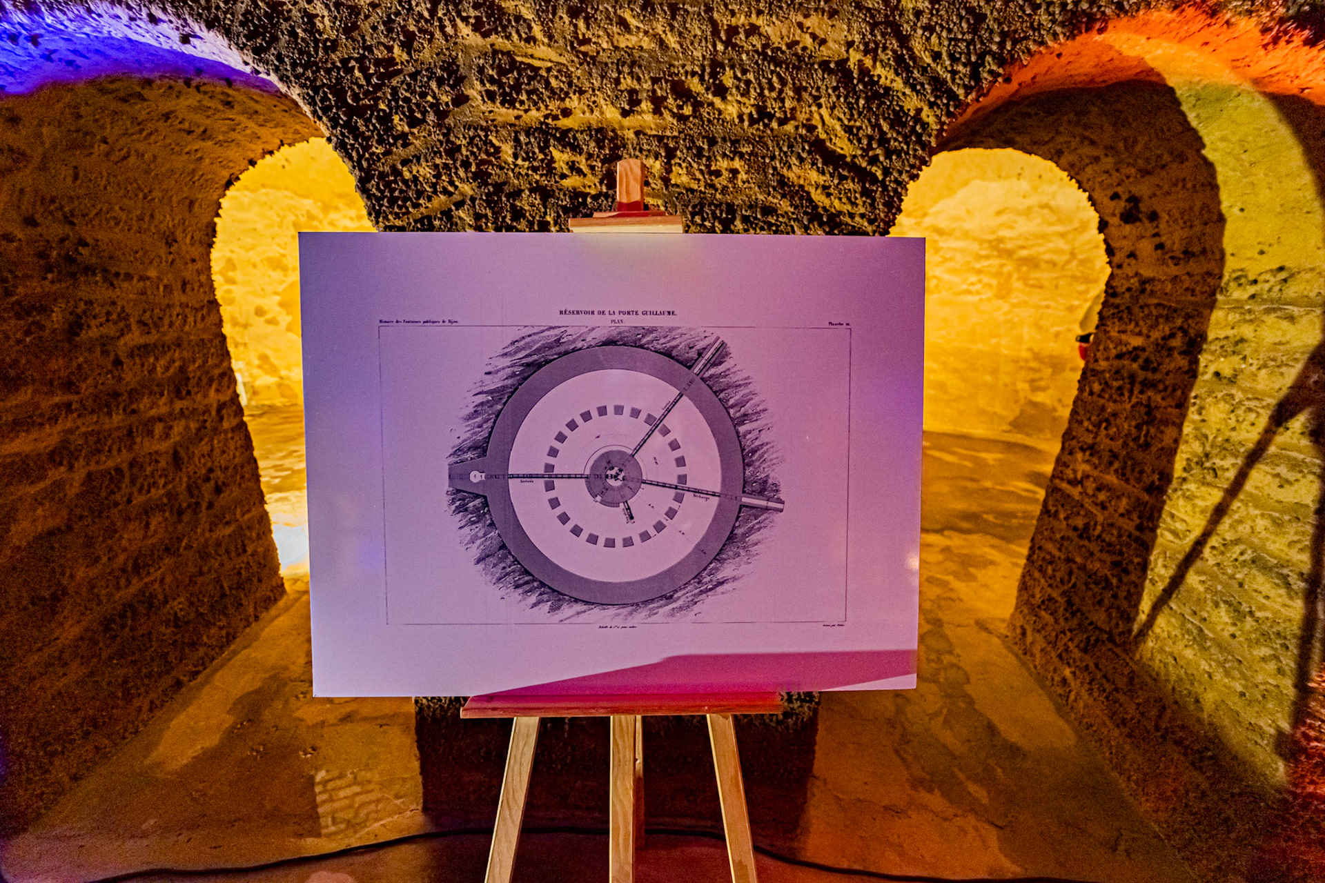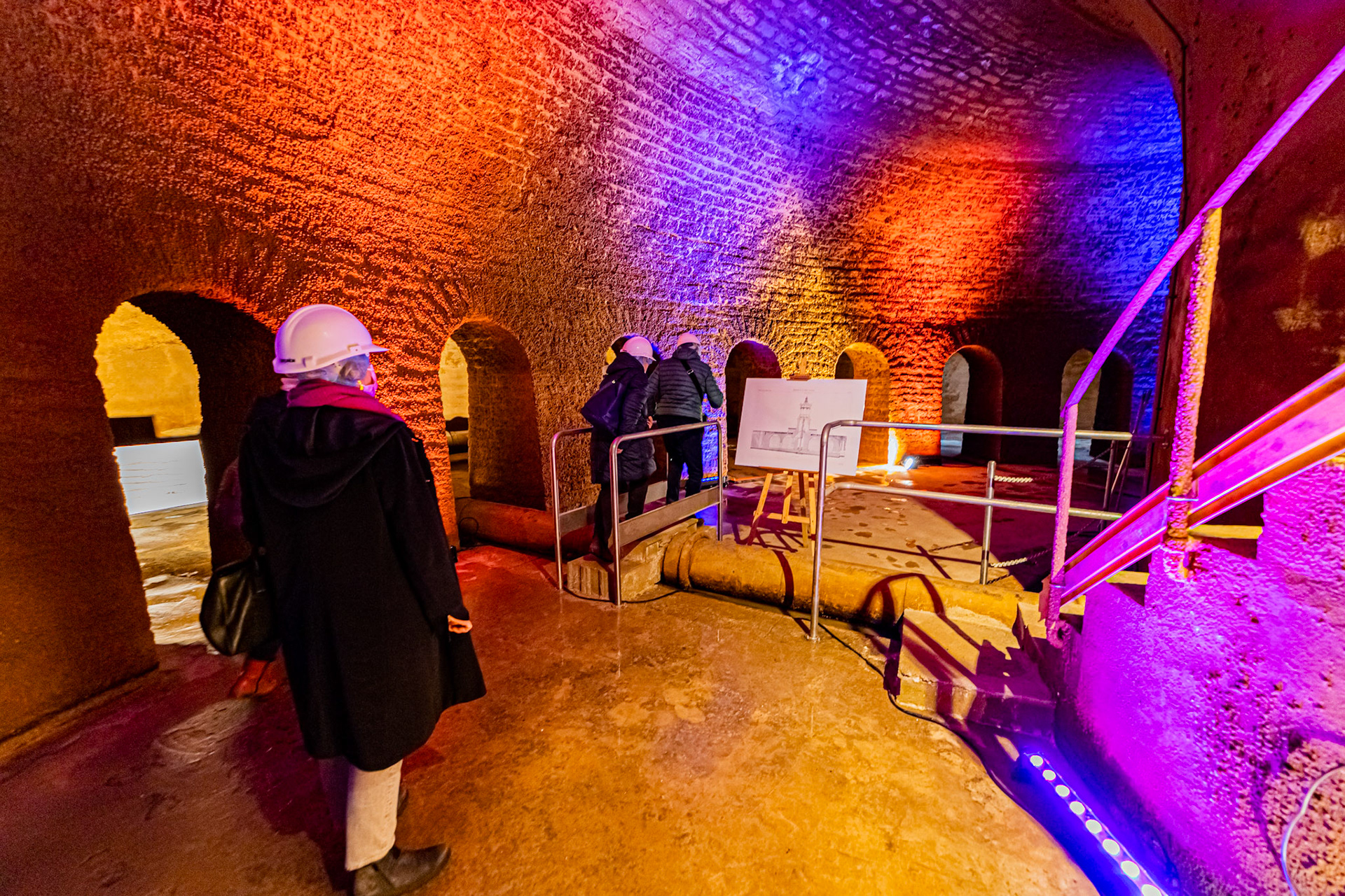 Visite de la salle voutée du réservoir Darcy, vidé une fois par an pour sa maintenance et les visites. Murs en pierres. Mise en lumière.
